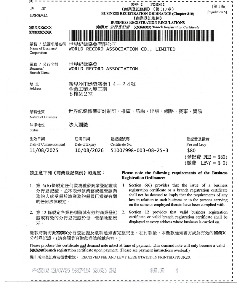 世界紀錄協會香港登記證